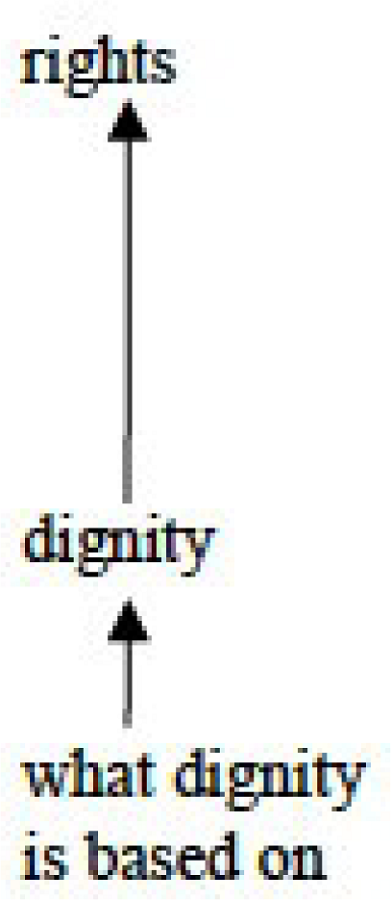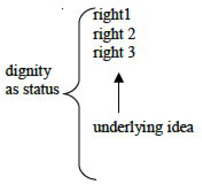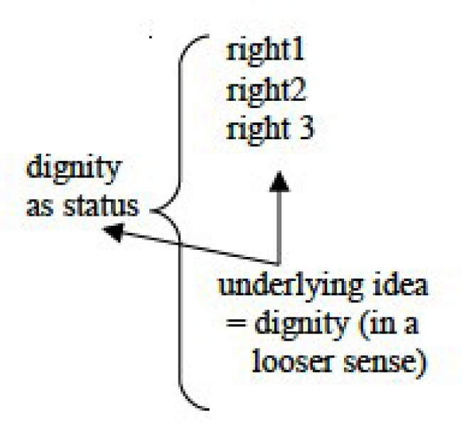 A figura 1 representa o fundamento de validade que resulta na dignidade da pessoa humana, funcionaria como uma fonte de direitos, na qual todos os demais (vida, liberdades em geral, etc.) estariam fundamentados por ela. Tal argumentação, explica o autor, é bastante comum na teoria divina (judaico-cristã) dos direitos humanos, defendida por um grupo de acadêmicos que entendem que a dignidade é um atributo divino aos seres humanos. Neste sentido, o fundamento de validade seria o valor divino concedido para a espécie.