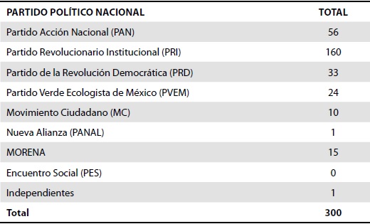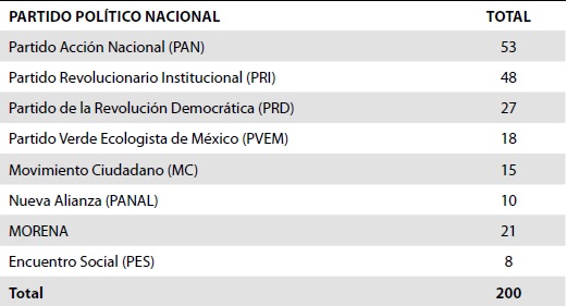 En consecuencia, y de conformidad con el Acuerdo INE/CG804/2015, el Consejo General procedió a asignar a los partidos políticos nacionales: Acción Nacional, Revolucionario Institucional, de la Revolución Democrática, Verde Ecologista de México, Movimiento Ciudadano, Nueva Alianza, MORENA y Encuentro Social, los diputados electos por el principio de representación proporcional que constitucional y legalmente les corresponden para el periodo 2015-201862, en los términos que a continuación se relacionan: