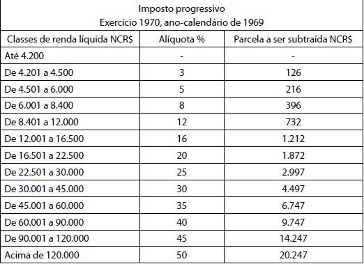Todavia, após sofrer a tributação específica, tais rendimentos eram somados e seu total se submetia à tabela progressiva geral, com alíquotas que variavam de 0,5% a 10%, conforme faixas crescentes de rendas.