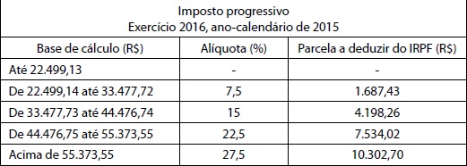 Quando sujeitos ao ajuste anual, todos rendimentos deveriam se submeter, no exercício 2016, à seguinte tabela, o que garantiria a generalidade da incidência do IRPF:
