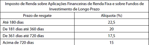 Mesmo quando tais rendimentos de capital são submetidos à tributação, a lei trata de lhes reduzir o encargo patrimonial, pela redução de alíquotas comparativamente às aplicadas sobre os rendimentos do trabalho. Assim é, por exemplo, com o rendimento líquido de aplicações financeiras de renda fixa e dos fundos de investimento, tributado à alíquota máxima de 22,5% (enquanto a maior alíquota incidente sobre o trabalho é igual a 27,5%), conforme tabela abaixo: