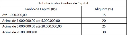 Note-se que o texto proposto pelo relator40 da citada proposição prevê condição mais branda para a tributação dos ganhos de capital: até R$ 5.000.000,00, à alíquota de 15%, acima de R$ 5.000.000,00 até R$ 10.000.000,00, à alíquota de 17,5%; acima de R$ 10.000.000,00 até R$ 30.000,00, à alíquota de 20% e acima de R$ 30.000.000,00, à alíquota de 22,5%. Enfim, tudo indica que haverá um favorecimento sobre tais rendimentos.