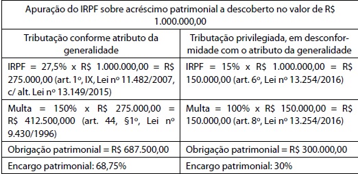 A simulação abaixo auxilia a constatação da lesão à generalidade, por privilegiar rendimentos de tais origens, imputando ao contribuinte que não oculta recursos no exterior um encargo patrimonial de 68,75% sobre os bens e direitos, bastante superior àquele incidente sobre o patrimônio objeto da regularização, de apenas 30%.