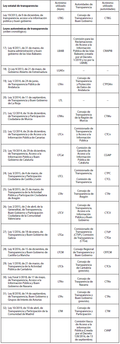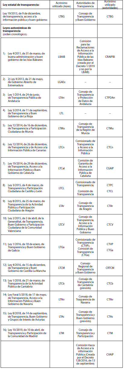En el análisis que se desarrollará en este artículo se tendrá en consideración además del Consejo de Transparencia y Buen Gobierno (CTBG) estatal, creado por la Ley 19/2013, de 9 de diciembre, de transparencia, acceso a la información pública y buen gobierno (LTBG), las autoridades con funciones análogas creadas en las Comunidades Autónomas españolas. En dicho nivel sub-estatal pueden observarse tres situaciones en relación con la existencia de leyes autonómicas de transparencia y autoridades de transparencia propias.
