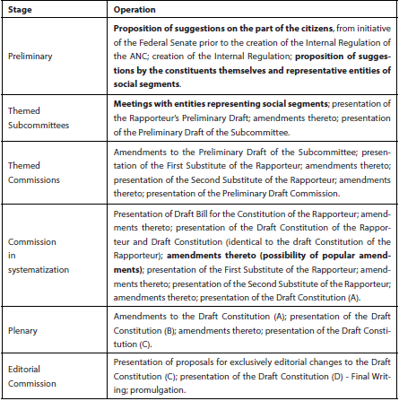 In relation to the construction process, which is of particular interest in this article, it is important to understand how popular participation took place within the ANC, with respect to the exercise of direct democracy. For this analysis it is necessary, initially, to be familiar with the functioning of the ANC, presented in general lines in Table 1, with the forms of direct popular participation highlighted in bold.