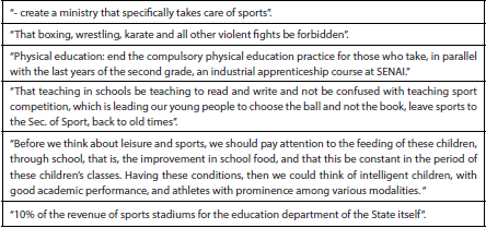 An interesting fact about these suggestions is that a large number of them were subscribed by Physical Education teachers. Their more elaborate character in relation to the other categories and the fact that they are only the fifth of the eight categories in terms of frequency of suggestions (Table 1) implies that the understanding of sports law and sports democratization was not necessarily a concrete popular demand of the period, but the result of technical/academic knowledge that is still poorly socialized. In addition, in this category, the search for quality assurance in providing services related to Physical Education and sports to the population, including through professional regulation, was quite evident.