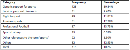 It can be seen from Table 1 that there was a certain balance between the categories of popular suggestions presented to the ANC. The greatest incidence of suggestions in the category “generic support to sports” can be explained by the fact that this category demonstrates the greatest possibility for comprehensive suggestions, due to its generic nature. In this category, the rule was that the suggestions only mentioned some form of support to sports or demanded it among a range of other activities, especially in schools, as can be seen in the examples in Table 2.