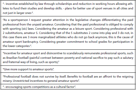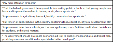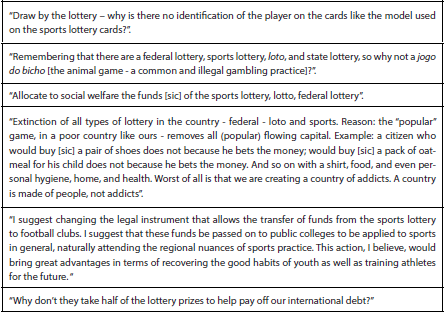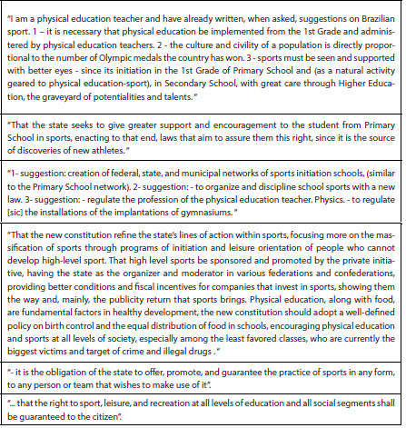 Although Table 9 presents several examples in some ways contrary to sporting practice, the most prevalent suggestion in the “Others” category was the creation of a sports ministry. As the contrary suggestions varied in their content and the suggestions regarding the ministry were similar, we chose to transcribe only one example of the former and several of the latter. This category also reinforces the illustration of certain unpreparedness by the citizens in relation to the themes pertinent to a Constitution, as discussed by Monclaire51.