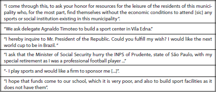 Analysis of the popular suggestions registered in the SAIC, besides allowing knowledge of the popular demands related to sports, could contribute to verifying the veracity or not of the mentioned unpreparedness of the population in relation to knowledge about the function of the originating constituent power. Moreover, the problems and contradictions identified in relation to the SAIC do not mean that it has been invalidated. On the contrary, as Monclaire38 puts it, this is a unique database in the world and with precious information about popular demands for the constitution that would be created and, more importantly, about several issues considered important by the population. The author only notes that specific studies on SAIC data should take into account the existence of such problems, taking necessary care in the analysis.