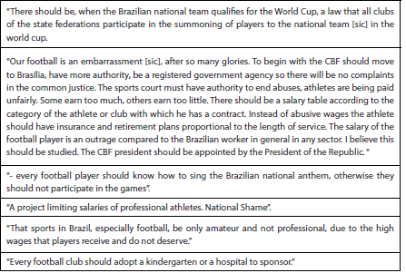 The category “Professional football” complements the previous one in the sense of including criticism on the professionalism and salaries of players, but goes further, addressing issues such as the management of the governing bodies and State support to them and to clubs, and complaints in general regarding the national men’s football, among others. In this category there seems to be preponderance of sports spectators and not of practitioners, physical education teachers or practice enthusiasts. Some examples that illustrate the category “Professional football” are presented in Table 6.