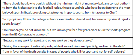 If analyzed under the assumptions of Bobbio29, it is possible to perceive that the way in which this mixed democratic exercise was performed, with direct participation through institutional representation, actually demonstrated a representation of interests of a certain social segment and not necessarily of collectivity. Since only the constituent entities of the organized sports system were selected to participate in the court hearings, it seems natural that only their interests dealt with in the ANC, as legitimate interests of the so-called “national sports community”, were defended.