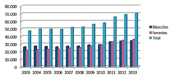 La Universidad Mayor de San Simón, de la ciudad de Cochabamba-Bolivia, se suma a este proceso de masificación en la matrícula universitaria favorable para las mujeres. Con más de 70.000 estudiantes distribuidos entre sus 13 facultades, los datos que muestran una evolución en la matrícula estudiantil con mayor presencia de estudiantes mujeres a partir del 2012, como se observa en la siguiente figura 1: