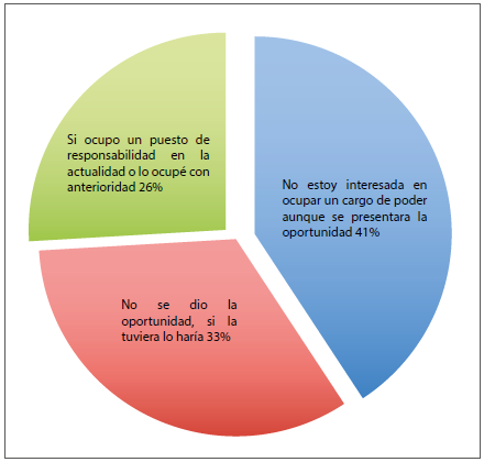 Otro 41 % afirmó no estar interesada en ocupar un cargo de poder, aunque se presentara la oportunidad, debido principalmente a las siguientes razones: