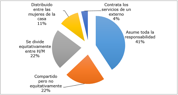 Por otro lado, cuando se consultó a las encuestadas contratar los servicios de un externo para este sobre la organización del trabajo doméstico, tan propósito y el porcentaje restante declaró asumir solo el 22 % señaló que los quehaceres domésticos toda o casi toda la responsabilidad del trabajo se dividen de manera equitativa entre los miembros doméstico en el hogar. hombres y mujeres de la familia; un 4 % afirma contratar los servicios de un externo para este propósito y el porcentaje restante declaró asumir toda o casi toda la responsabilidad del trabajo doméstico en el hogar.