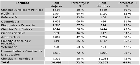 No obstante, si se realiza un análisis diferenciado la población estudiantil de la Facultad de Ciencias y por áreas de estudio se puede apreciar que existe Tecnología, con una representación del 28 % frente una clara segregación de carreras universitarias por a un 72 % de población estudiantil masculina, como sexo en las distintas facultades, nuevamente con se observa en la tabla 1: una considerable desventaja para las mujeres entre la población estudiantil de la Facultad de Ciencias y Tecnología, con una representación del 28 % frente a un 72 % de población estudiantil masculina, como se observa en la tabla 1: