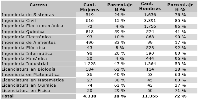 De manera general, se puede apreciar que no se trata de pequeñas diferencias. Los datos muestran claramente que la FCyT es la Facultad con menor participación de mujeres. Con una oferta de 17 carreras se constituye en una de las facultades más importantes y con mayor número de estudiantes matriculados, aproximadamente 16.000 para el semestre II del año 2014 y una población de 1.595 docentes e investigadores (personal académico). De este total, tan solo el 28 % de la población estudiantil y el 22 % del personal académico está constituido por mujeres.
