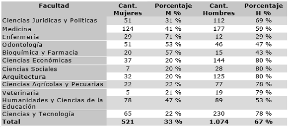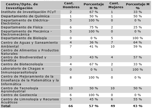 El personal académico de la UMSS está compuesto por personal a dedicación parcial y dedicación exclusiva, es decir, personal que se dedica exclusivamente a la docencia, y además se dedica a la investigación; y personal que se dedica exclusivamente a la investigación. En la Facultad de Ciencias y Tecnología, de un total de 295, solo el 22 % del personal académico está constituido por mujeres, como se detalla en la tabla 3:
