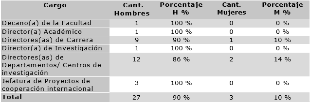 Así, entre el personal académico que actualmente ocupa cargos de jefatura en la Facultad de Ciencias y Tecnología, existe una mínima participación femenina, como puede observarse en la tabla 5:
