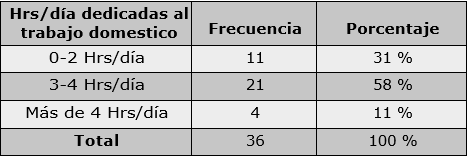 En cuanto a la cantidad de horas que las horas diarias al trabajo doméstico. Extrayendo una encuestadas dedican a los quehaceres domésticos; cifra promedio de los datos obtenidos, se deduce el 31 % afirma dedicar de 0 a 2 horas al día; que las encuestadas realizan alrededor de 3 horas mientras que una mayoría, el 58 % dedica de 3 a 4 de trabajo doméstico diario. horas diarias; finalmente, el 11 % dedica más de 4 horas diarias al trabajo doméstico. Extrayendo una cifra promedio de los datos obtenidos, se deduce que las encuestadas realizan alrededor de 3 horas de trabajo doméstico diario.