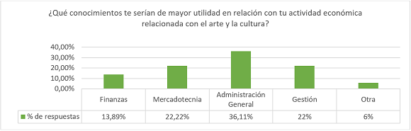 Cabe mencionar que los conocimientos útiles más mencionados fueron los de administración general, seguidos de mercadotecnia, gestión y por último finanzas, así que las habilidades básicas a desarrollar deben estar orientadas primordialmente a la administración general y mercadotecnia, pues en la Facultad de Artes se imparten ya materias de gestión.