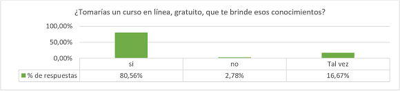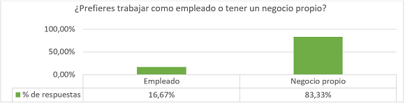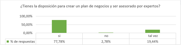 Los resultados de la encuesta indicaron una necesidad de emprendimiento en el ámbito laboral artístico, así como disposición para emprender, previa capacitación. En las Figuras 3 hasta 12, se aprecian las preguntas, así como las respuestas proporcionadas por los encuestados y su respectivo porcentaje.