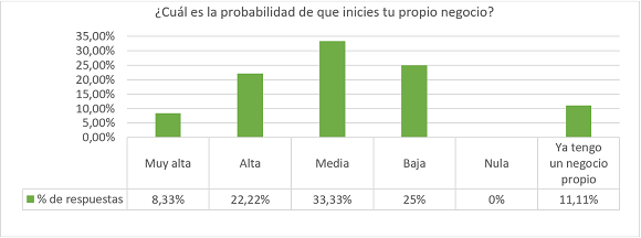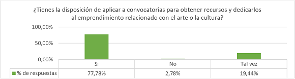 Aun así, una gran mayoría de los encuestados prefirieron ser autónomos en vez de empleados, cerca de la mitad consideró alta o muy alta su posibilidad de concretar la creación de una empresa, acorde a las ideas de Florida (2002, 2014) y Gabe, Florida y Geller (2012) indican que en la actualidad existe una clase creativa, coincide también con la percepción de los encuestados sobre las dificultades económicas y de valoración, pues el resto consideró media o baja la probabilidad de emprender, tan solo 11 % tiene ya una empresa o negocio relacionada con el arte o cultura lo que es consistente con Zallo, (2016), quien indica que la industria creativa en Boga excluye comúnmente a las artes. Parece entonces necesario el emprendimiento de acuerdo con las opiniones de los encuestados, pues se mostraron, al menos en la encuesta, dispuestos a aplicar a convocatorias, o recibir asesoría, el principal obstáculo mencionado para emprender es el económico, esto se corresponde con la afirmación de Quartesan, Romis y Lanzafame (2007), cuando dicen que en Latinoamérica, a pesar de su potencial, el emprendimiento en arte no se lleva a cabo por falta de financiamiento y acceso a mercados regionales.