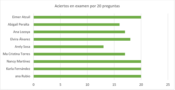 De acuerdo con Bernal (2015), solo un 4 % de los alumnos que se inscriben a cursos abiertos en línea los terminan, en este caso, tomando en cuenta el promedio de alumnos que vieron los videos podemos señalar que el porcentaje de alumnos que completó el curso fue de 5.2 %, pues 10 personas presentaron el examen en línea creado mediante la herramienta gratuita Google Forms; ahí se les solicitó su nombre y datos, solo una persona obtuvo una calificación no satisfactoria con 13 aciertos de veinte posibles, los nueve restantes aprobaron el curso, obteniendo más de 16 aciertos; en la Figura 15 se pueden observar los aciertos por participante.