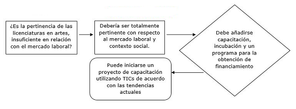 La información recabada: la Misión de la Facultad de Artes, la revisión de los planes de estudio, perfiles de egreso y las opiniones del primer director del entonces Instituto de Bellas Artes, en 1991, Manuel Talavera, en entrevista con el autor, indican perfiles de egreso relacionados con: docencia, creación y gestión artísticas; mientras que el panorama laboral de la ciudad y estado de Chihuahua no es adecuado para dichas competencias. De la contraposición de conceptos que puede verse en la Figura 1, se muestra la necesidad de capacitación si se contraponen los enunciados de los cuadros de arriba contra los de abajo.