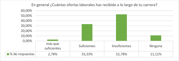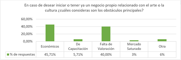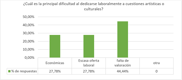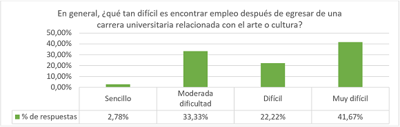 Cerca del 64 % de los encuestados perciben como difícil o muy difícil el obtener un empleo al egresar de una licenciatura relacionada con el arte o cultura; así mismo, a lo largo de su carrera, no han obtenido las opciones laborales suficientes. La principal dificultad que indican es la falta de valoración de sus actividades, seguida de dificultades económicas y escasa oferta laboral. Esto último plantea una dificultad, pues la percepción de no ser valorados puede indicar tanto que, el ambiente no es propicio para los artistas y las actividades culturales, o que los mismos no han desarrollado las habilidades para relacionarse comercialmente en la sociedad, lo anterior es acorde a la noción de Liñán, Fernández y Romero (2013), quienes indican que en una sociedad incluyente el emprendimiento aumenta.