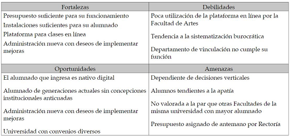 Mediante una matriz FODA (Fortalezas, Oportunidades, Debilidades y Amenazas) se propone una estrategia de solución al problema encontrado: baja pertinencia laboral de las licenciaturas impartidas en la Facultad de Artes y, por lo tanto, necesidad de proyecto de capacitación con vinculación al sector autoempleo de sus egresados dentro del contexto privado, público y otras dependencias universitarias, regional; la matriz contempla la creación de un se puede ver en la Tabla 1.