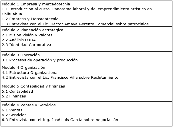 Así, se desarrolló el esquema general del curso para los contenidos, privilegiando conceptos de administración; además de los guiones necesarios para la producción audiovisual, se añadieron entrevistas a personas con experiencia en temas relacionados con los contenidos en concordancia con las recomendaciones de la unidad de «Seguimiento a Egresados de la Facultad de Artes», pues los exalumnos desean conocer la utilización práctica de los conceptos. En la siguiente Tabla 2, se puede apreciar el esquema utilizado.