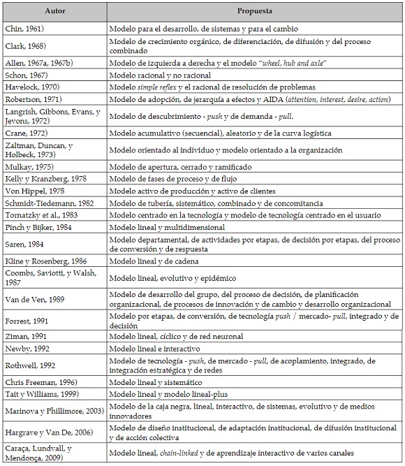 Una vez introducido el tema de discusión, se presenta en la Tabla 1 un recorrido histórico por los modelos de innovación propuestos por diferentes autores, en donde se incluyen algunos de los llamados modelos tempranos o "early models", hasta revisiones posteriores de modelos referenciados en la literatura desde los años 60 ( Godin, 2015).