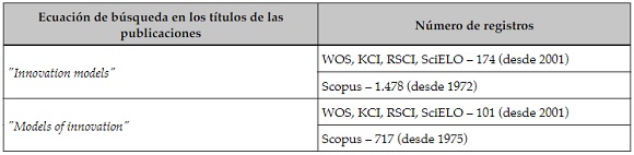 En línea con el recorrido histórico referenciado, a continuación, se realiza una revisión de la literatura sobre modelos de innovación indexada en la colección principal de WOS (Web of Science), KCI - Korean Journal Database, Russian Science Citation Index, SciELO Citation Index y Scopus, a partir del año 1972, con el fin de verificar el estado reciente de la discusión. Esta revisión muestra que 2.470 trabajos han sido orientados al estudio de los modelos de innovación como tema indexado en las bases de datos, cifra a la que se llega después de revisar las diferentes ecuaciones de búsqueda en inglés, idioma con mayor índice de publicación ( Englander, 2009), tal como se presentan en la Tabla 2.