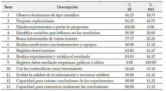 Durante la aplicación de la estrategia se observaron en la mayoría de los estudiantes habilidades para observar fenómenos específicos, formular posibles explicaciones sobre la base del conocimiento cotidiano, identificar variables que pueden influir en los resultados de un experimento, buscar información en fuentes diversas, realizar mediciones con instrumentos y equipos adecuados a las características y magnitudes de los objetos, registrar observaciones, realizar experimentos y verificar el resultado, utilizar las matemáticas como herramienta para organizar, analizar y representar datos, extraer conclusiones de los experimentos que realizan y comunicar oralmente las conclusiones obtenidas. Se resalta la capacidad de los estudiantes para diseñar experimentos en equipo usando las Tecnologías de la Información y Comunicación. Sin embargo, se observó dificultad en el registro de datos mediante esquemas, gráficos o tablas.