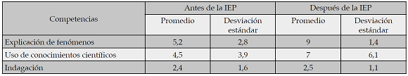 Cuando se compara el promedio de aciertos antes y después de la aplicación de la IEP (Tabla 2) se observa un mejoramiento en las tres competencias: en 'explicación de fenómenos', de 5,2 a 9, un mejoramiento de 3,8; en 'uso comprensivo del conocimiento científico', de 4,5 a 7, un mejoramiento de 2,5; y en 'indagación', de 2,4 a 2,5; un mejoramiento de 0,1.