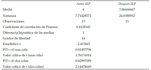 Al evaluar la presencia de diferencias estadísticamente significativas, según la prueba t-Student ( Tabla 3), que permite compara las medias antes y después de la IEP, la hipótesis nula se rechaza, lo que se significa que la diferencia de Esto se corrobora por el P-valor = 0.02995589, que es medias es significativa antes y después de la IEP. inferior a la 0.05, el valor significancia.