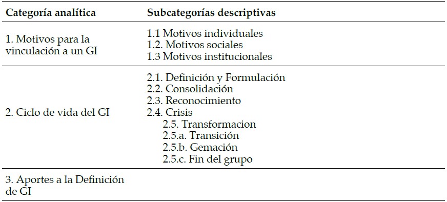 Desde la recolección y el análisis de la información se construyeron tres categorías inductivas. La primera correspondió a un enfoque individual, centrado en los motivos que tienen los investigadores para integrar un GI; en la segunda se abarcó su ciclo de vida, y en la última categoría se articularon las anteriores en una definición integral de lo que se entendería como GI (Ver Tabla 1).