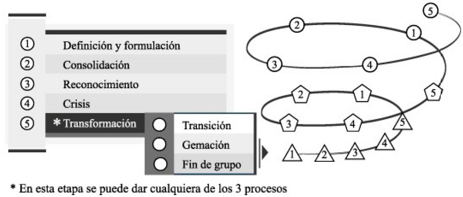 Es así como en la Figura 1 se esquematiza un modelo en espiral, para describir las fases del ciclo de vida de un GI (en este caso Psicología y Salud), bajo el supuesto de que las etapas se podrán vivir una y otra vez, con niveles crecientes de aprendizaje y complejidad, pues el grupo es un sistema vivo, que requiere de acomodaciones y adaptaciones constantes, ante las variaciones del ambiente interno y externo en el que se encuentre, postura que difiere de modelos lineales que se plantearon con anterioridad ( Rey-Rocha, Martín y Sebastián, 2008; Hamui, 2011).