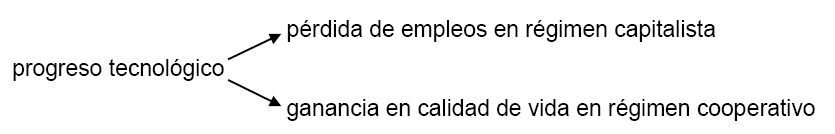 La verdad es que los avances tecnológicos causan desempleo y que hasta ahora nadie nos ha dicho qué puede hacerse para evitar esta consecuencia. Yo me atrevo a insinuar que nada podrá eludirla pero que hay una manera de salvar a los trabajadores que resultan ?redundantes? al ser reemplazados por máquinas. Este remedio parcial es la sustitución de la propiedad privada por la cooperativa de producción.