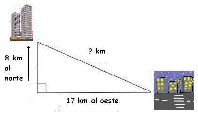 7. Una ciudad se encuentra 17 km al oeste y 8 km al norte de otra. ¿Cuál es la distancia real lineal entre las dos ciudades?