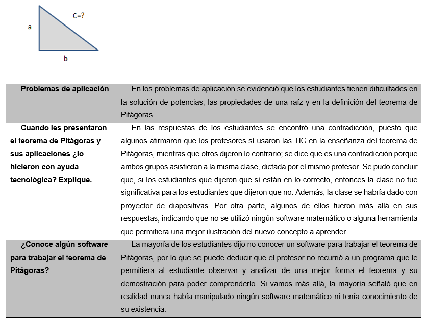 En la caracterización de los procesos de aprendizaje de los estudiantes de conceptos geométricos y, específicamente del teorema de Pitágoras, se encontraron deficiencias profundas, confusión en la construcción de conceptos y dificultades con la justificación de las propiedades. En consecuencia, se elaboró una hoja de ruta que, a partir de una revisión teórica, permitiera identificar las principales estrategias utilizadas para el desarrollo del pensamiento geométrico. En este sentido fue posible implementar herramientas tecnológicas que sirvieran como mediador y punto de soporte de la propuesta pedagógica. En cuanto a la implementación de estrategias mediadas por las TIC, se hizo necesario caracterizar los conocimientos previos e indagar sobre la experiencia previa de los estudiantes con relación al uso de las tecnologías. Por ello el hecho de que la mayoría de estudiantes nunca hubieran tenido la oportunidad de manipular algún software matemático, incidió favorablemente en su grado de motivación durante el proceso.