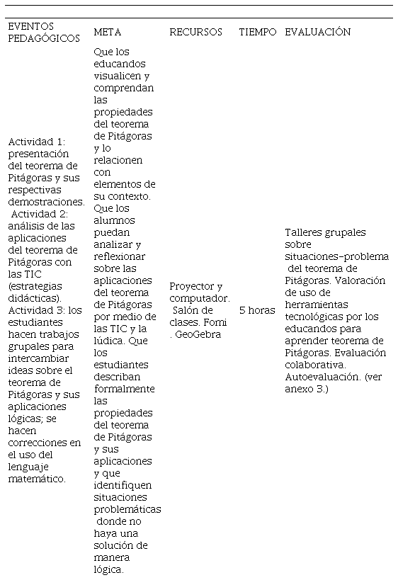 La propuesta pedagógica inicia con una serie de actividades de clase, que incluye una prueba diagnóstica, para caracterizar los saberes previos de los estudiantes. A partir de aquí, se demuestra la funcionalidad contextual del teorema de Pitágoras con la mediación de la aplicación GeoGebra. Este programa facilita que los estudiantes comprendan los conceptos de manera clara y específica (hipotenusa y catetos) y les permite ver gráficamente sus aplicaciones prácticas, puesto que muestra diferentes formas de concretizar esa abstracción de las matemáticas y posibilita la participación de todos los estudiantes en el desarrollo de las actividades.