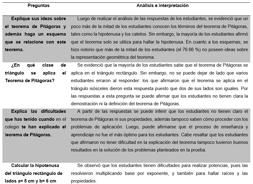 El análisis de los hallazgos indica que el desarrollo epistemológico del teorema de Pitágoras incide positivamente en los procesos de enseñanza y aprendizaje de los estudiantes porque les ayuda a comprender, desarrollar y relacionar nociones y teoremas, al tiempo que, desde la perspectiva de la evolución histórica de la didáctica de las Matemáticas, podrán descubrir y crear conceptos propios y aplicarlos de mejor manera durante las clases ( Barreto-García, 2008).