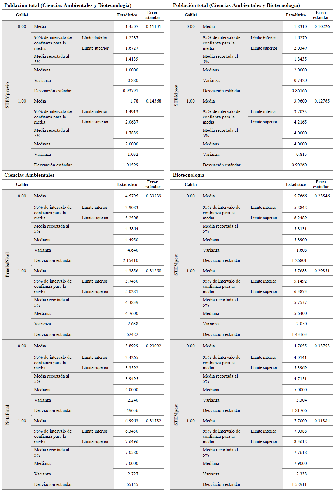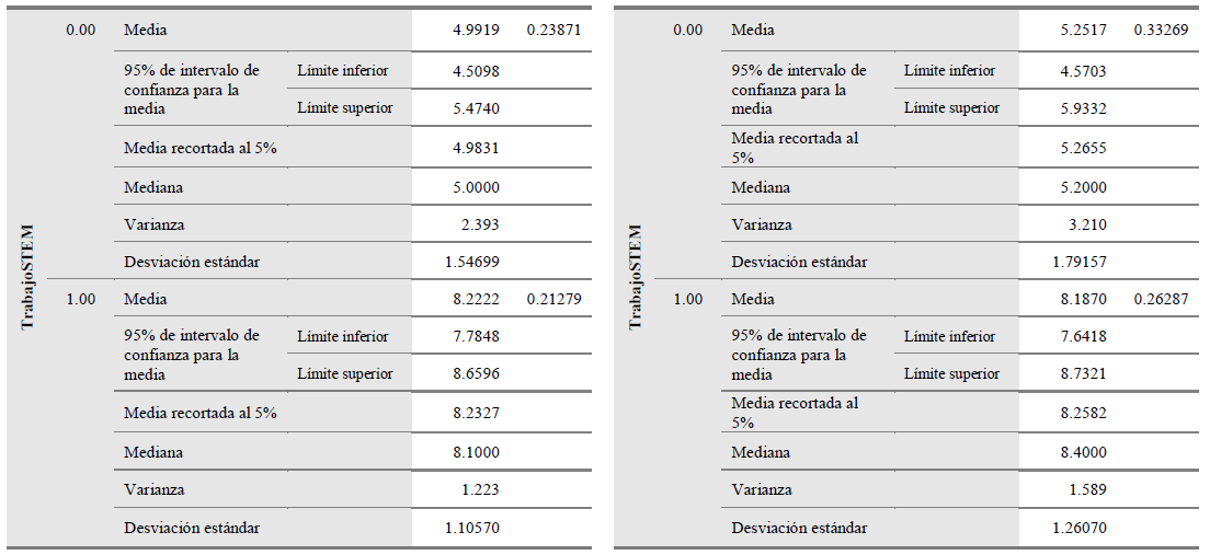 La tabla 1 muestra para las variables dependientes, los valores alcanzados por sus estadísticos descriptivos, considerando media, media al 95 % de confianza con una significación del 5 %, media recortada al 5 %, mediana, varianza y desviación estándar.