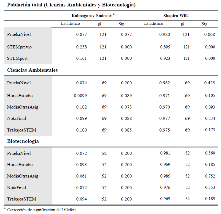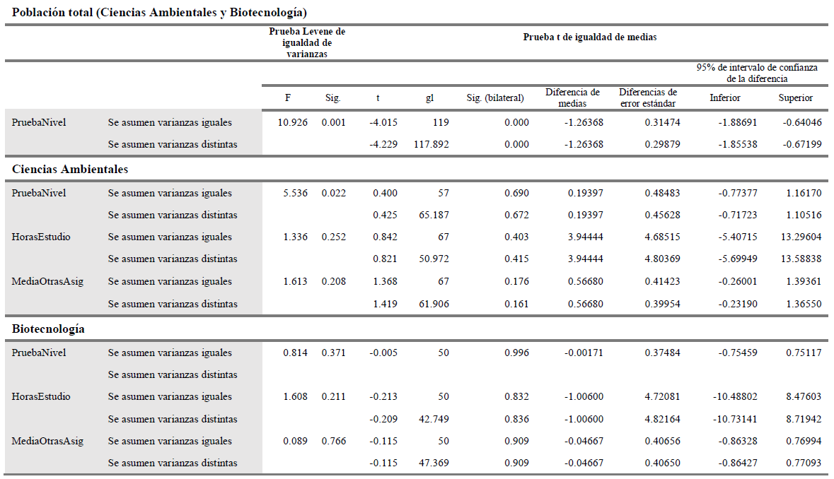 Asimismo, antes de comenzar con el análisis de las variables recogidas que dan respuesta a los objetivos planteados, es necesario saber si existieron diferencias significativas entre los dos grupos de alumnos estudiados inicialmente, es decir, aquellos que cursaban la titulación de Ciencias Ambientales y aquellos que estudiaban Biotecnología.
