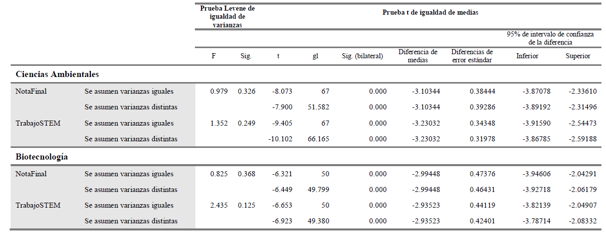 Con el análisis de los resultados, se observaron importantes diferencias de medias entre el grupo experimental y el grupo control para las variables NotaFinal, TrabajoSTEM y STEMpost, consideradas las dos primeras para cada una de las titulaciones estudiadas (puesto que, como se explica en el apartado a y en la tabla 3, existen diferencias significativas entre los conocimientos iniciales de los alumnos procedentes de las dos titulaciones) y la tercera para el total de la población (puesto que, como se explica en el apartado b y en la tabla 3, no existen diferencias significativas entre la percepción STEM inicial de los alumnos procedentes de las dos titulaciones).