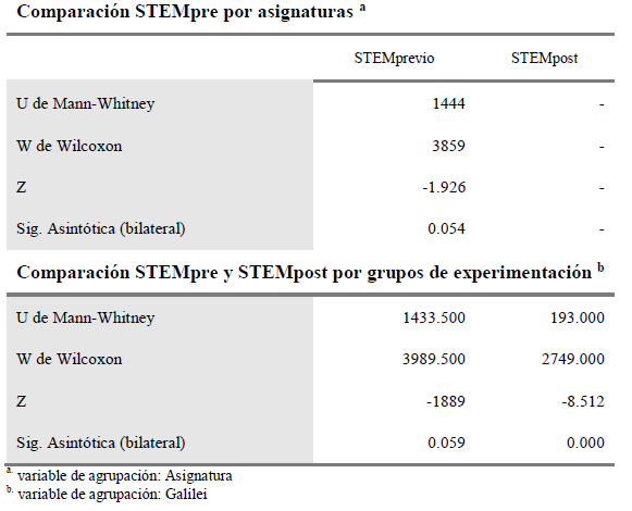 Tal y como se muestra en la tabla 5, no hubo diferencias significativas entre las dos titulaciones para la variable STEMpre, con lo que se puede estudiar el efecto de la investigación sobre el total de la población, comenzando por verificar que no existieron diferencias iniciales entre el grupo control y el grupo experimental, lo que validó el diseño experimental utilizado.