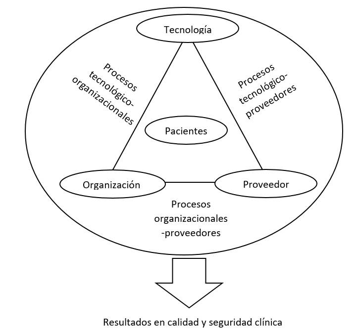 Un modelo reportado en la literatura y denominado como el Triángulo ( Ancker et al., 2012), (Ver figura 1) parte de la premisa de que los resultados sobre la efectividad de las intervenciones TIC en salud no son concluyentes, en parte, por la dispersión de enfoques de evaluación usados. Así, los autores apoyados en el modelo de Avedis Donabedian, que enfatiza una perspectiva sistémica de los determinantes de la calidad en salud, proponen un enfoque que evalúa la calidad y seguridad en los resultados de intervenciones TIC en salud.