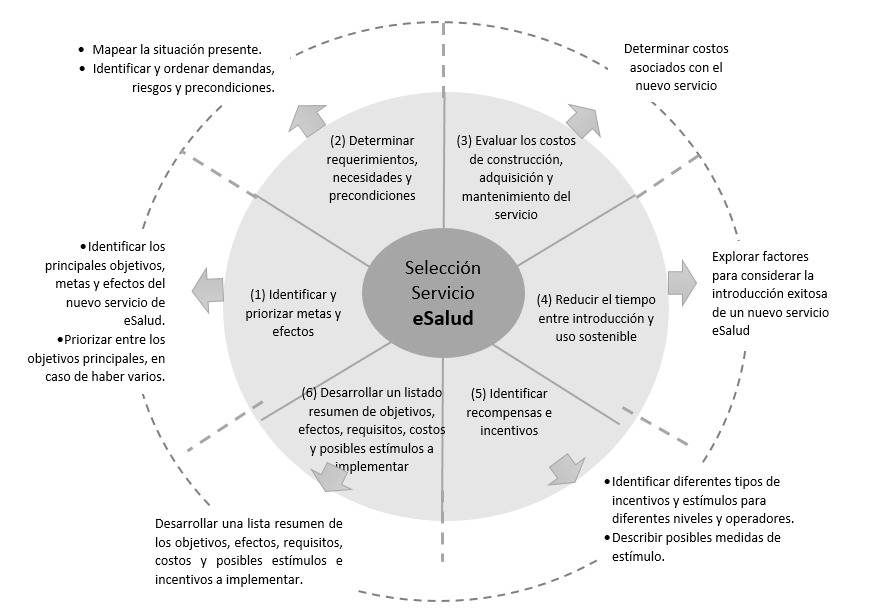 También se encontraron enfoques con fuerte énfasis clínico-administrativo ( Haddad et al., 2013). Específicamente el propuesto por Mettler & Vimarlund, (2017) (Ver figura 2) entiende las intervenciones eSalud en la lógica de servicios y negocios, es decir, la tecnología como un producto que las organizaciones adquieren. Basado en seis pasos, el modelo propuesto está preocupado no tanto por los resultados, como por las decisiones de adopción tecnológica. Su argumento parte de que la selección y priorización de los servicios en eSalud es el primer momento para lograr una evaluación holística del impacto de los servicios de salud electrónica y, por lo tanto, el énfasis debe concentrarse en esta fase.
