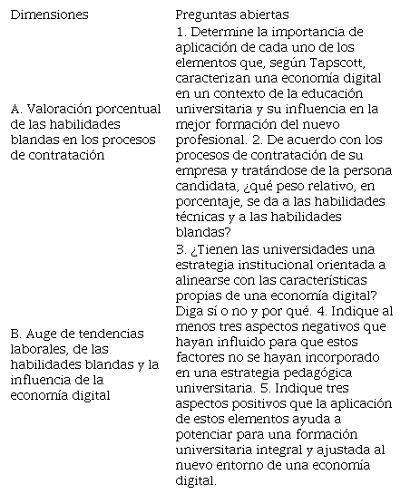 En la segunda etapa, se diseñó una entrevista con preguntas abiertas. Según Mondy (2010), este tipo tiene la naturaleza de no ser dirigida y de necesitar de más tiempo para obtener la información de diferentes candidatos. En la Tabla 1 se muestra la estructura de la entrevista con cinco preguntas abiertas, relacionando cada pregunta con dos dimensiones, a partir de las cuales se analizó la valoración porcentual de las habilidades blandas en los procesos de contratación (2 preguntas) y el auge de las tendencias laborales, de las habilidades blandas y la influencia de la economía digital (3 preguntas).